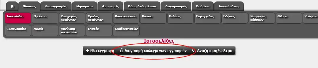 Για να διαγράψετε μια ή περισσότερες εγγραφές / γραμμές του πίνακα, επιλέγετε το πλαίσιο επιλογής (checkbox) αριστερά από κάθε γραμμή του πίνακα και κάνετε κλικ στην επιλογή [Διαγραφή επιλεγμένων εγγραφών] στο επάνω μέρος πριν τον πίνακα.
