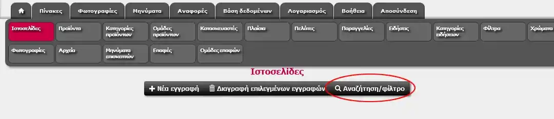 Για να αναζητήσετε κάποια εγγραφή ή να περιορίσετε τον αριθμό των γραμμών που εμφανίζονται, επιλέγετε [Αναζήτηση/φίλτρο] στο πάνω μέρος πριν τον πίνακα.