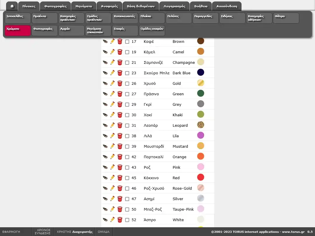 Πίνακας χρωματολογίου στον οποίο καταχωρούνται οι επιλογές χρωμάτων του πεδίου «Χρώμα» του πίνακα προϊόντων. Κάθε χρώμα μπορεί να είναι συμπαγές (μονόχρωμο), διαβάθμιση (από χρώμα έως χρώμα) ή υφή (όπως δέρμα, λεοπάρ κ.λπ)