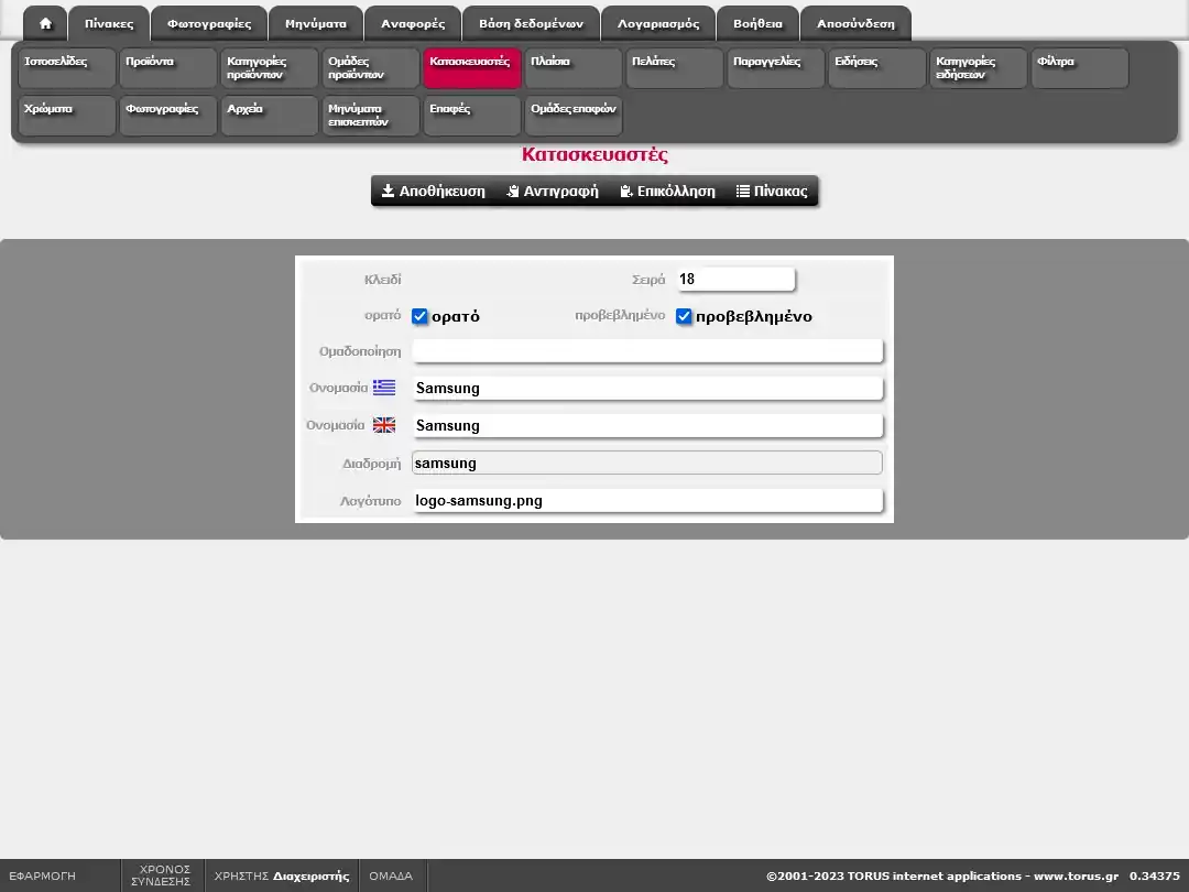 Στον πίνακα κατασκευαστών καταχωρούμε τους κατασκευαστές (μάρκες - brands) των προϊόντων του e-shop. Ο κατασκευαστής του κάθε προϊόντος επιλέγεται από την φόρμα επεξεργασίας του προϊόντος, μέσω του αντίστοιχου πλαισίου επιλογής.