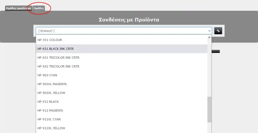 Μετά την καταχώρηση μιας ομάδας προϊόντων μπορούμε να συνδέσουμε (αντιστοιχίσουμε) τα σχετικά προϊόντα της ομάδας αυτής.