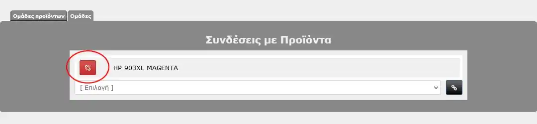 Αντίστοιχα, για να αποσυνδέσουμε (αφαιρέσουμε) το προϊόν από τη συγκεκριμένη ομάδα, κάνουμε κλικ στο πλήκτρο αποσύνδεσης, αριστερά του προϊόντος.