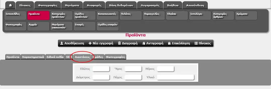 | Μεγέθη | Πληροφοριακό πεδίο που αναγράφει τα διαθέσιμα μεγέθη. Αν έχει εγκατασταθεί το πρόσθετο «Χρώματα - Μεγέθη» μπορείτε να καθορίσετε το υπόλοιπο αποθήκης ανά μέγεθος |